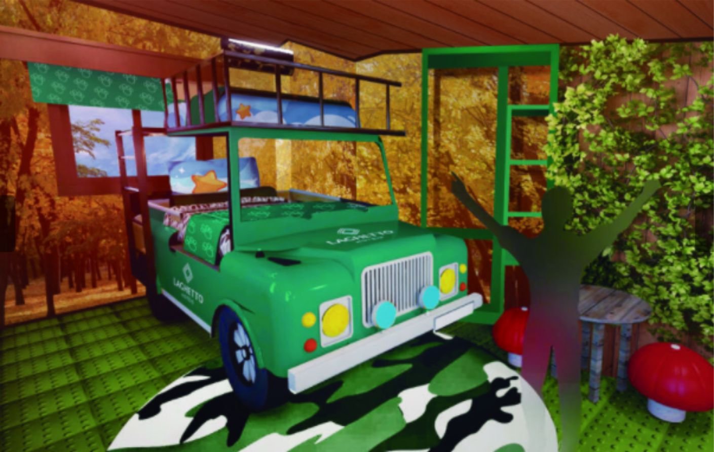 As suítes vêm para proporcionar aos nossos hóspedes uma experiência imersiva de hospedagem, começando por um corredor inteiro da unidade que estará com temática florestal, ambientação que originalmente é a casa do nosso querido mascote. Já nas suítes imersivas, iremos disponibilizar mini floresta, esconderijos e acampamentos, oferecendo camas dentro de barracas, entradas secretas e pequenos portais, beliche em formato de Jipe, banheira e telas superiores para desfrutar ainda mais das aventuras que estamos preparando.