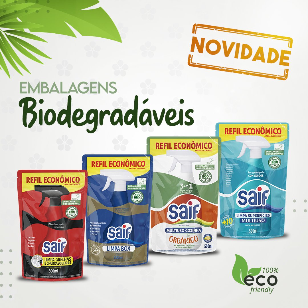 A escolha dos itens na gôndola do supermercado pode ser, também, um ato de compromisso com a sustentabilidade. É isso que propõe a marca gaúcha Saif ao apresentar, de forma pioneira no país, produtos de limpeza com embalagens biodegradáveis. Inicialmente, são quatro soluções que chegam aos consumidores com esse diferencial: os refis do ‘Saif Limpa Grelha e Churrasqueira’, do ‘Multiuso Cozinha Orgânico Saif’, do ‘Saif Limpa Superfícies’ e do ‘Saif Limpa Box’.