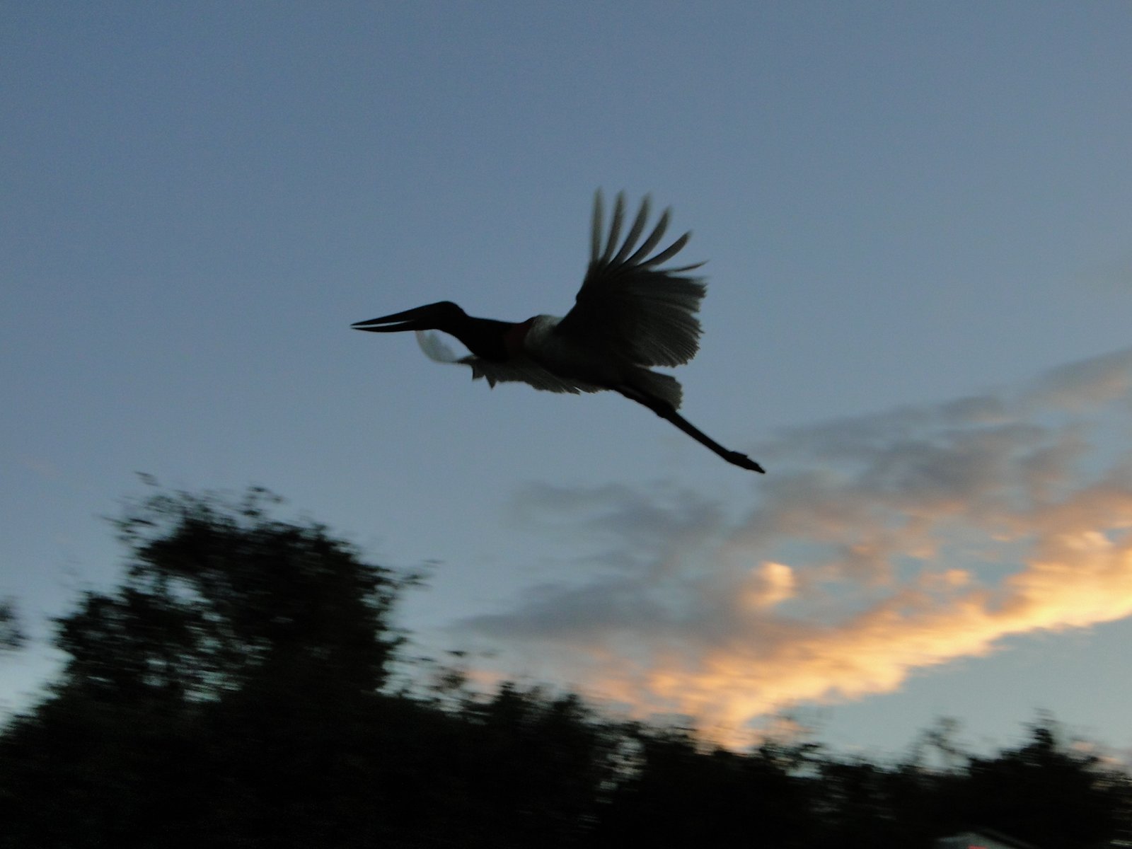 É uma cegonha; como tal, voa com seu pescoço e pernas esticados, ao contrário das garças e seus pescoços encolhidos durante o vôo.
